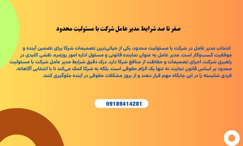 با تمام شرایط مدیر عامل شرکت با مسئولیت محدود آشنا شوید. از نحوه انتخاب، مدت مدیریت و شرایط قانونی تا مسئولیت‌ها. برای اطلاعات کامل کلیک کنید!
